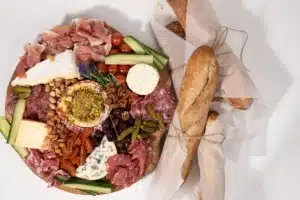 - Zet de camembert in het midden van de plank en verdeel de andere kazen en vleeswaren over de plank.