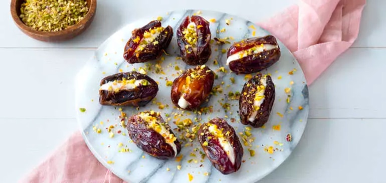 - Vul de dadels met de vulling en garneer met de pistachenoten en eventueel extra sinaasappelrasp.