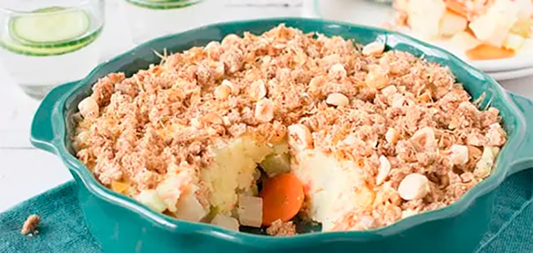 - Schep de groente in een ovenschaal en dek af met de aardappelpuree. Verdeel het notenmengsel erover.