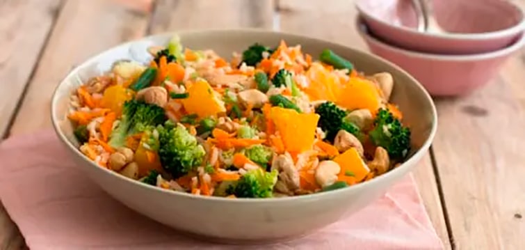Rijstsalade met groente, sinaasappel en cashewnoten