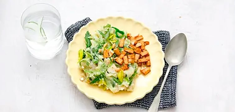 - Schep de tofu erop en strooi de gehakte noten erover.