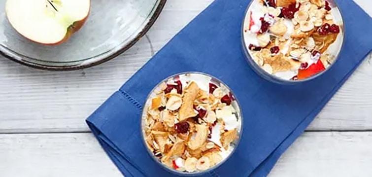 - Verdeel de appelblokjes over glazen, schenk de yoghurt erover en schep de hazelnotenmuesli erop.